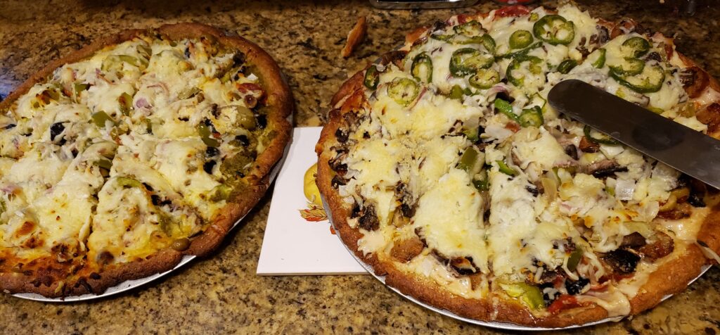 We love pizza! My son’s favorite kind of pizza is what we call a green pizza, so we usually make two pizzas for pizza night. We will make one green pizza and the other will be something else. On this night, the other pizza was an alfredo pizza. You do not have to use fathead dough for the pizza crust. You can use whatever kind of crust you normally use. Do whatever works for your family.