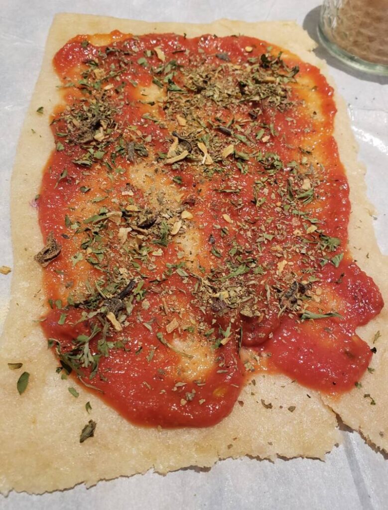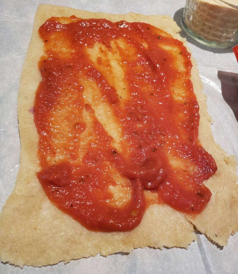 Spread pizza sauce over the surface of the fathead dough to about an inch from each side.