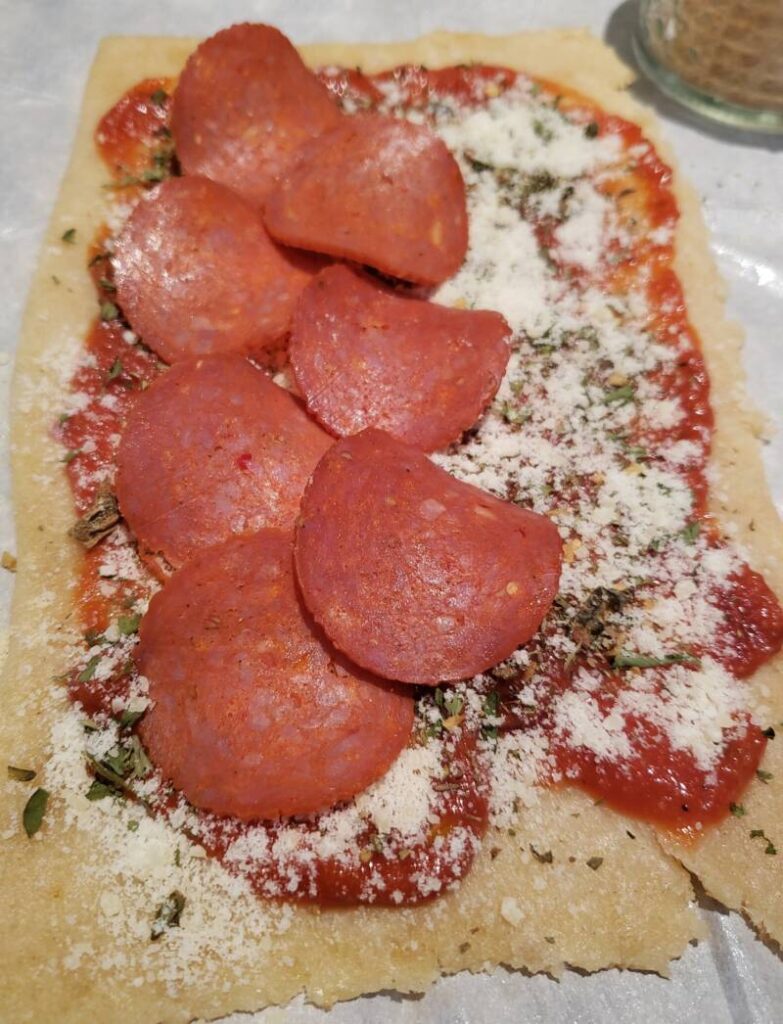 - Place the pepperoni slices about halfway on top of the seasonings to cover the surface of the fathead dough.