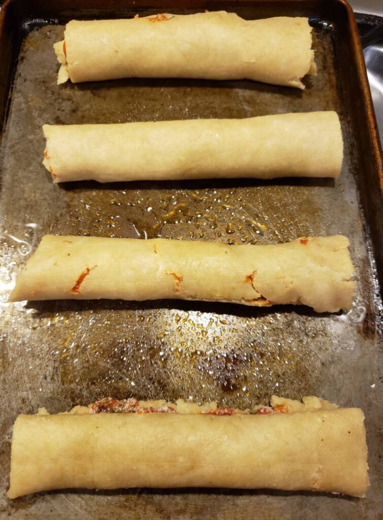 - Roll each section as if making cinnamon rolls. Pinch the ends to seal and place on a greased baking sheet.