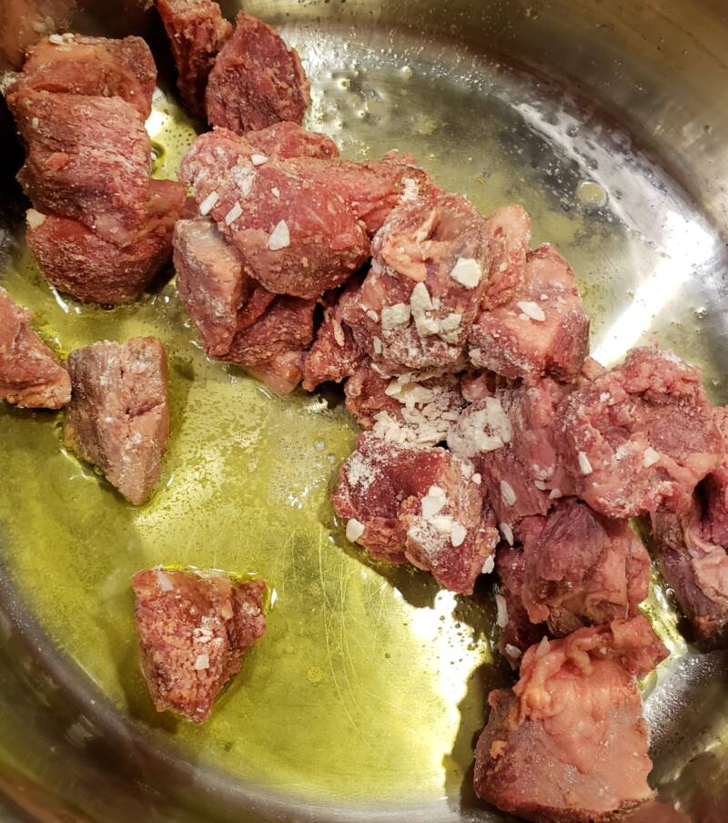 - Brown the stew meat in some olive oil on all sides. Remove and set aside.
