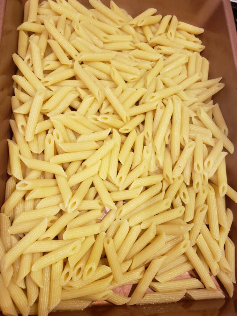 - Spread the noodles in the bottom of a rectangular baking dish.
