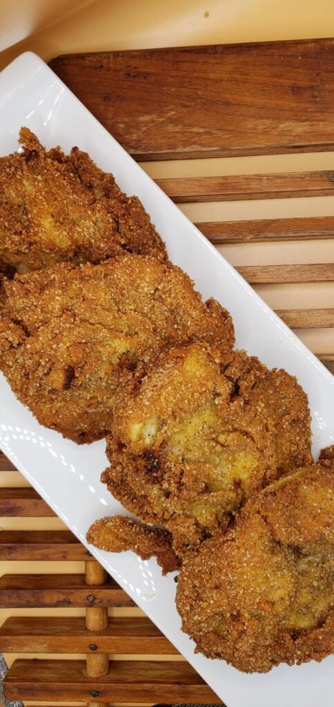 I usually make fried Eggplant using round slices, but this time I got a bee in my bonnet to make planks. Eggplant Parmesan works no matter how you slice it, but I will make rounds for future endeavors. Fried Eggplant is perfect for leftover Eggplant Parmesan the next day. I like to plan ahead and make extra. You can make fried eggplant using flour or almond flour.