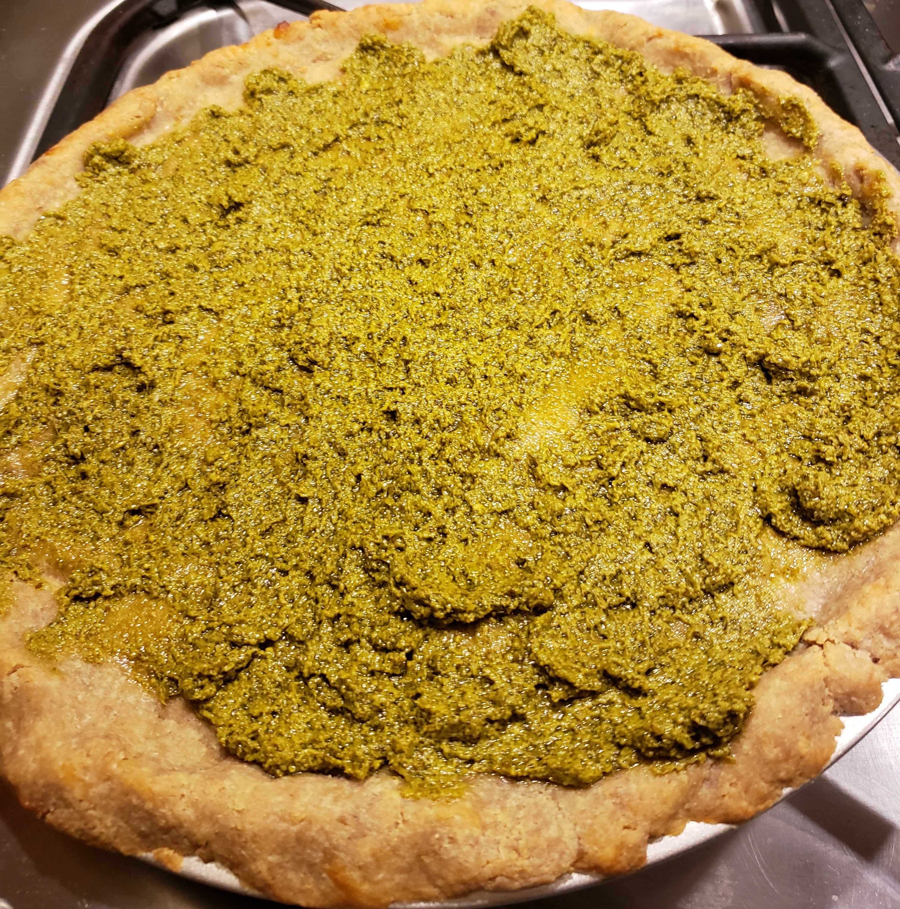 Spread the caramelized onions and mushrooms over the top of the pesto.
