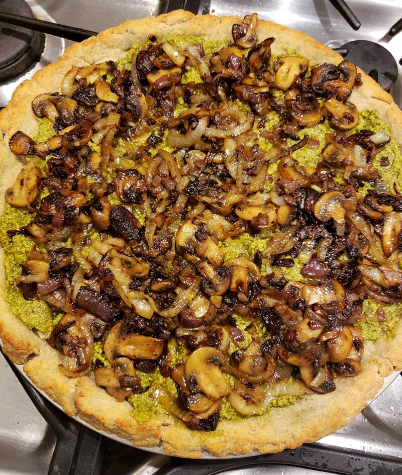 Caramelized onions, mushrooms and pesto sauce make up the ingredients to one of my favorite pizza combinations.