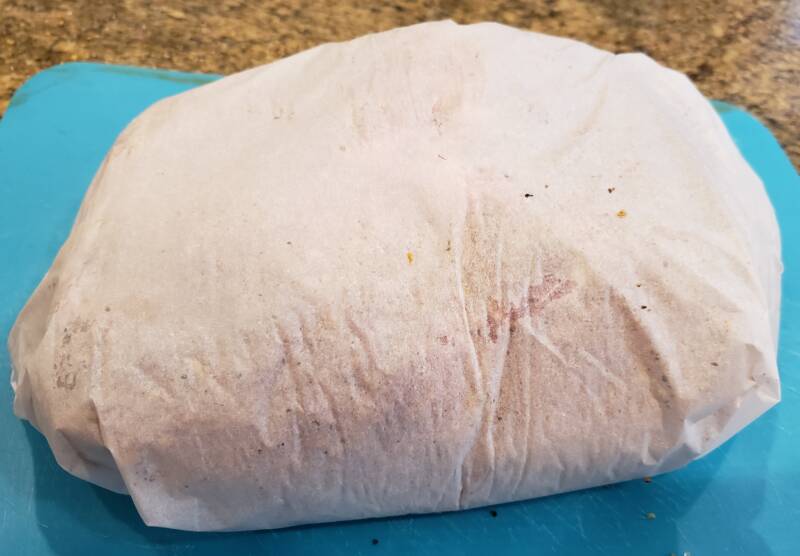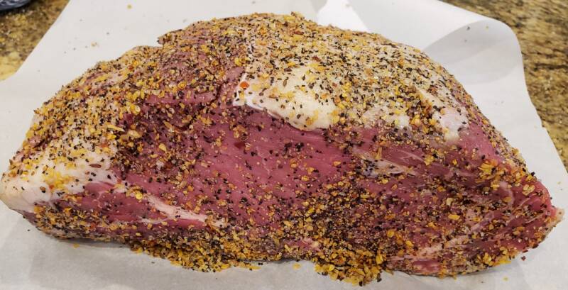 Remove the parchment paper when the roast is ready to go in the oven. The salt will cause the roast to sweat, so pat it dry with a paper towel. Season well with Montreal steak seasoning or whatever rub you prefer.