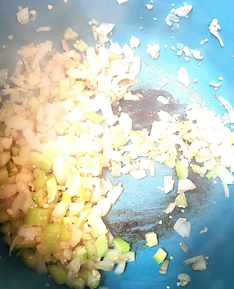 - In a large soup pot, saute the onions, celery and garlic in olive oil until translucent.