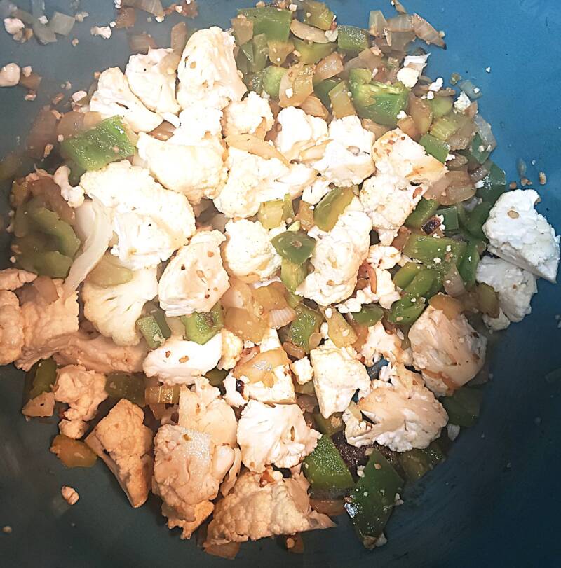 - Add the green pepper and cauliflower. Cook for 5 minutes until the cauliflower is tender.