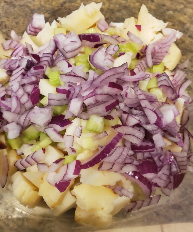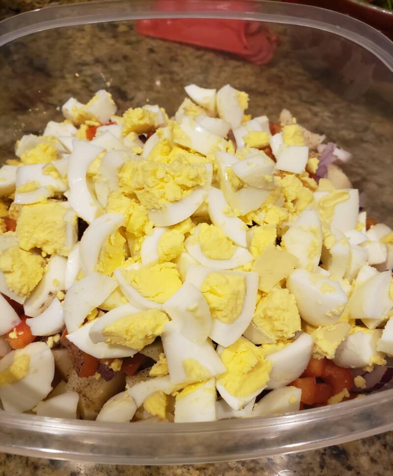 On the day of preparation, remove the eggs and potatoes from the refrigerator. Chop the eggs and cube the potatoes. Combine in a bowl. I usually mix it in a large refrigerator storage container so all I have to do is slap a lid on it to store it.