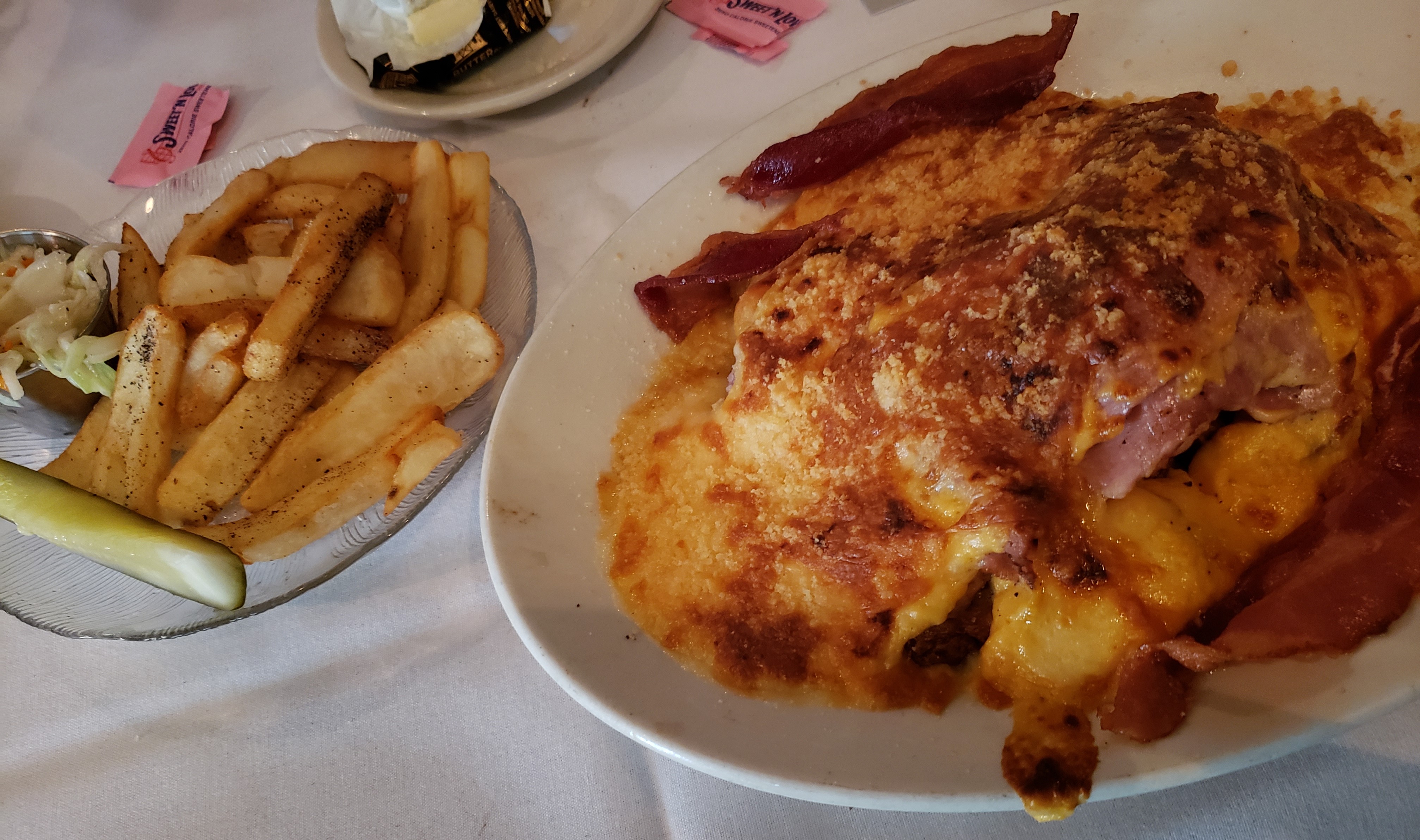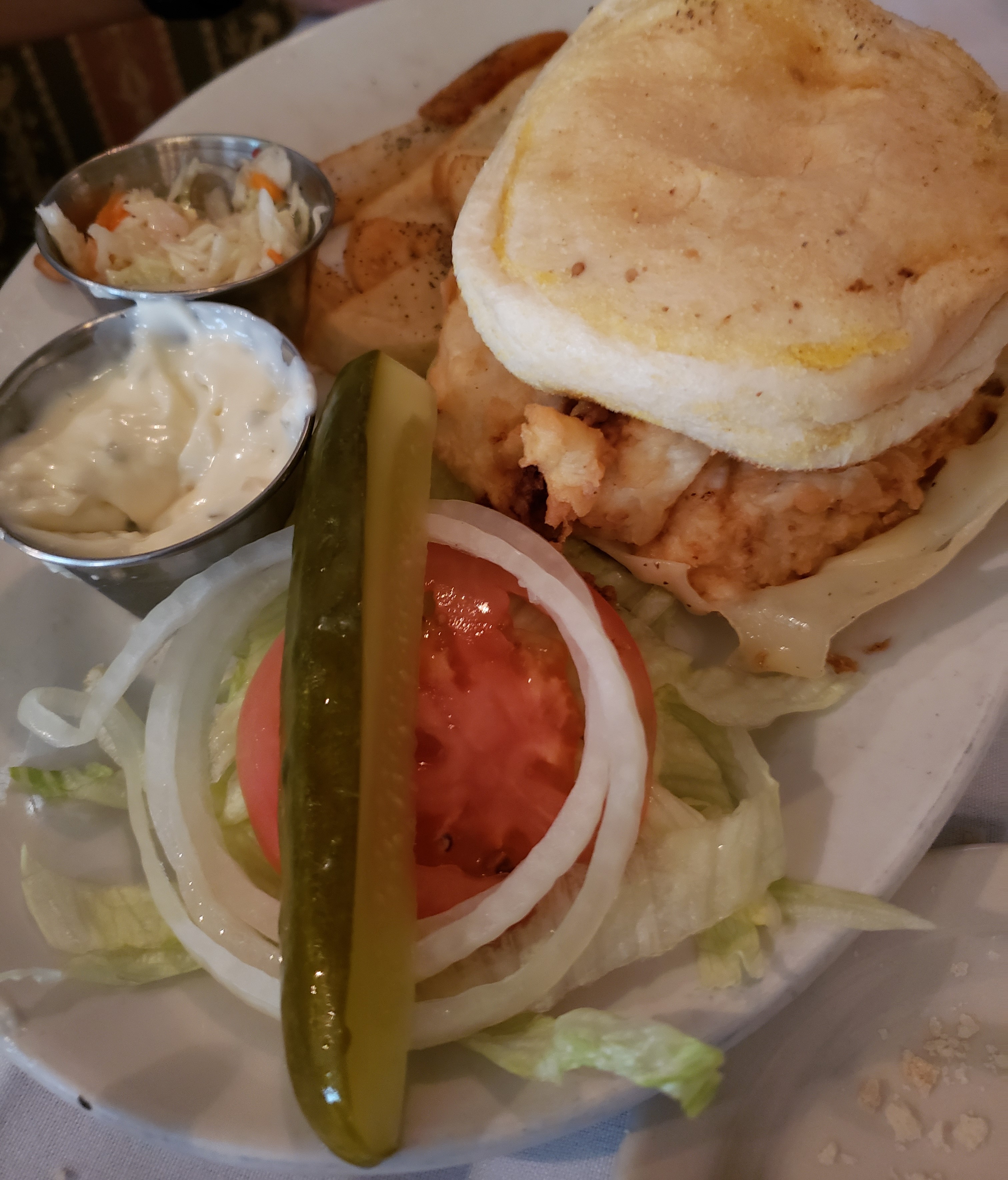 I ordered The Prosperity Sandwich, which was a Kentucky Hot Brown, as described on the menu. A Kentucky Hot Brown is a hot, open-faced sandwich layered with ham, turkey, bacon, béchamel sauce and cheese. The Prosperity Sandwich was served with a large plate of French fries, a crisp pickle, and coleslaw. My son and husband ordered a Fried Cod Sandwich with a large plate of French fries and coleslaw. The portions were huge, and the food was hot and fresh.