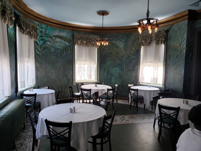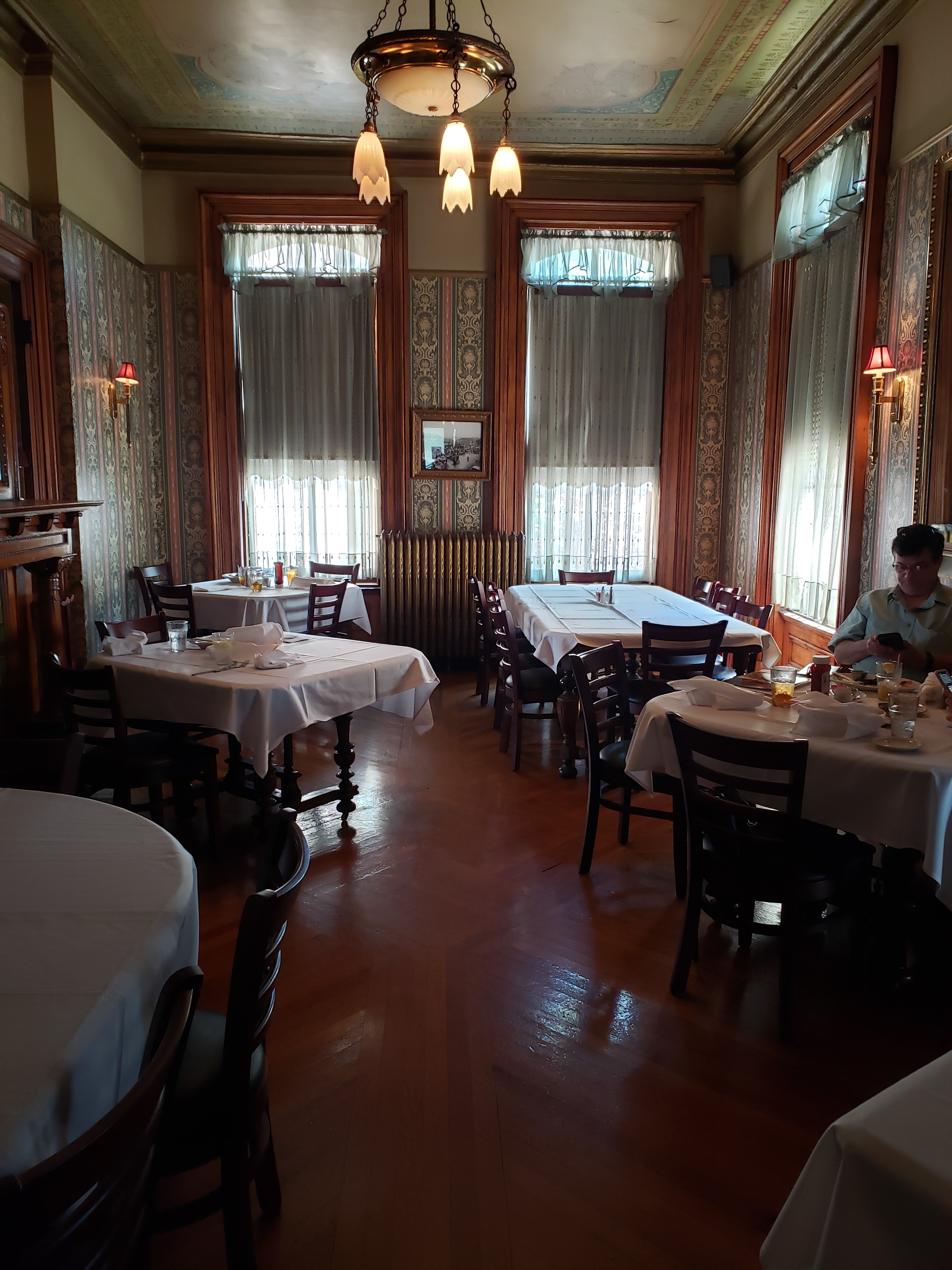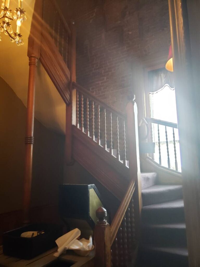 The Lemp Mansion now functions as a restaurant, hotel and event venue. Most of the décor is original to the structure, built around the turn of the 19th century. Only a few areas in the mansion have been modernized to outfit their usage to today’s standards. Since we were in the area, my family decided it would be fun to eat at the restaurant. I was slightly skeptical about how good the food would be, but I was pleasantly surprised and delighted that it was delicious and the portions were huge! We made lunch reservations, but we didn’t need them. We were seated in what was formerly the main living room, which was on the back side of the house past the foyer and stairway.