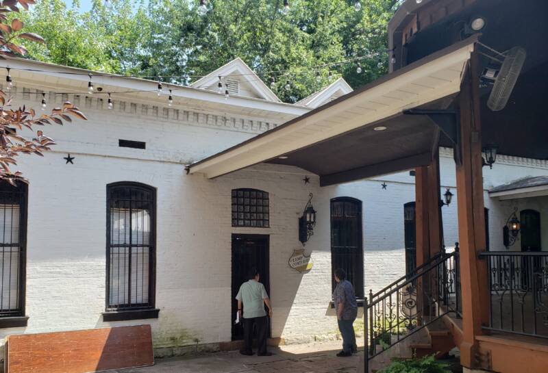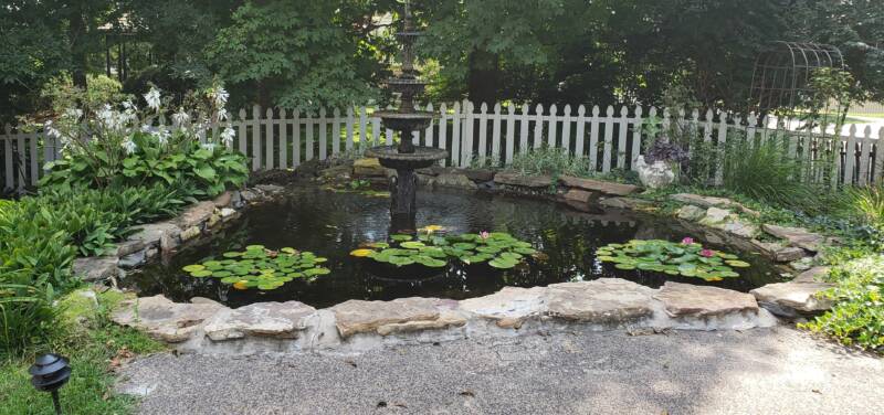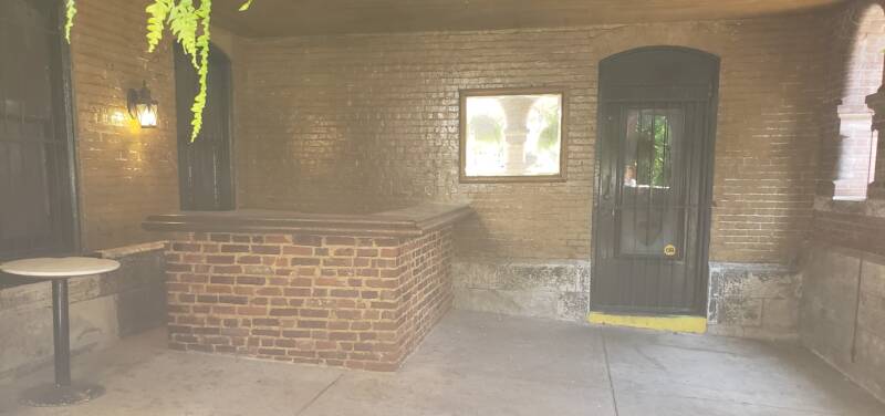 The covered brick back entrance to the mansion provides an area for kitchen staff and caterers close to the event to come and go as needed. A small fountain adds some charm to the area.