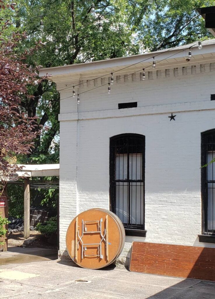 Directly behind the covered event space is a white building known as the Coach House. In the late 19th century, this entire area in the back was most likely where the stables and carriages were kept for the family and employees. The Coach House offers an indoor event space.