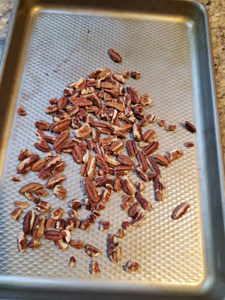 - In the meantime, place the pecans on a baking sheet or in a dry frying pan. If using a baking sheet, roast in the oven for 10 minutes at 350 degrees. If using a frying pan, stir the pecans until they are fragrant. Keep an eye on them because they can burn quickly.
