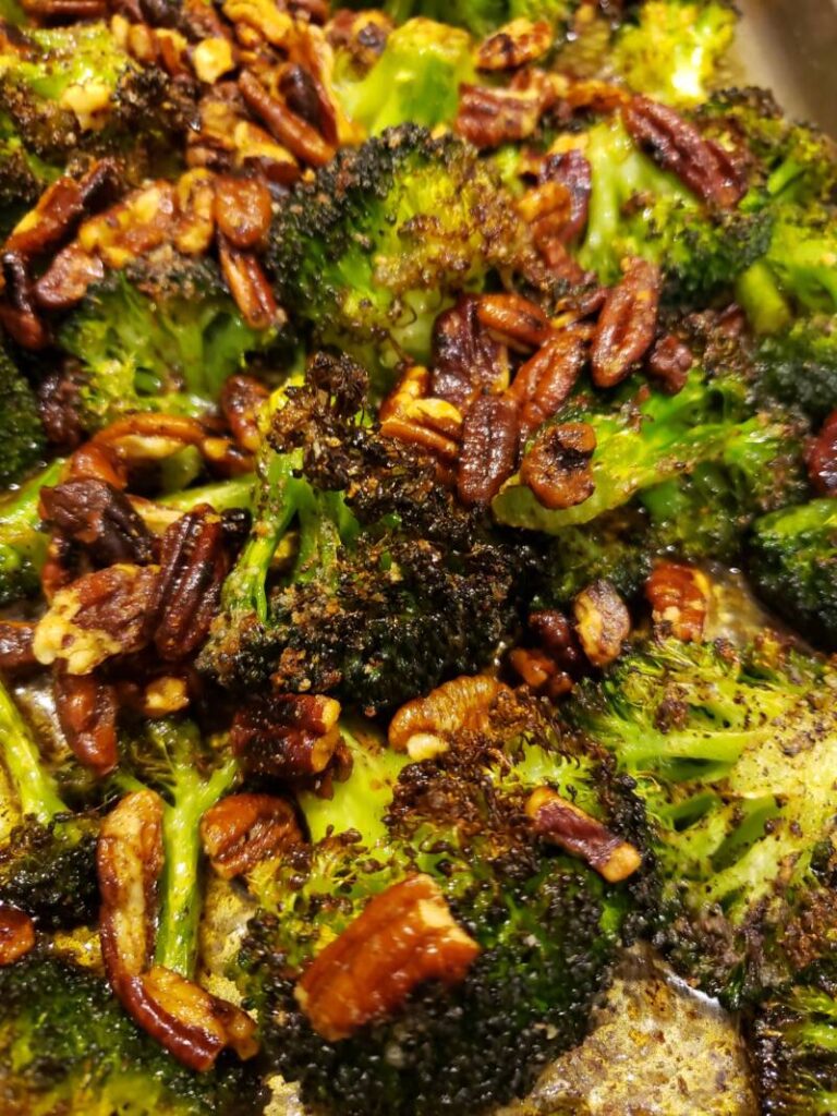 Finding fresh ideas for the same old, same old veggies can be challenging. We like variety around here, so changing up the veggie lineup sometimes takes some creativity. Roasting broccoli already brings out a nutty flavor, so adding some nuts seemed like a logical idea. Roasted Broccoli with Buttered Pecans is an easy side dish that elevates the ordinary. It cooks in the oven while preparing the rest of the meal.