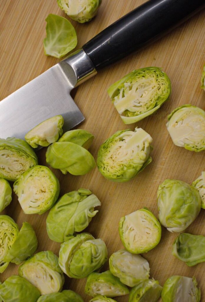 Preheat the oven to 400 degrees. Spread the halved Brussels sprouts on a sheet pan.