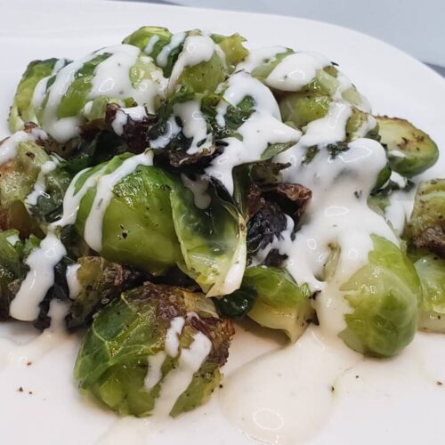 - To serve, place a portion of Brussels sprouts on a plate and drizzle with as much ranch salad dressing as you want.