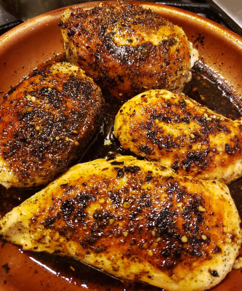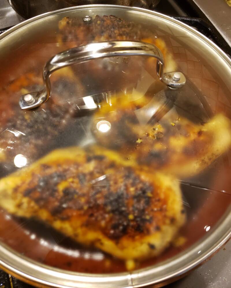 Transfer the chops or chicken back to the skillet Cover and allow to simmer until the meat is tender, about 30-35 minutes. Turn the chops once during cooking. Add the tiniest bit of water if the sauce seems to cook down too much.