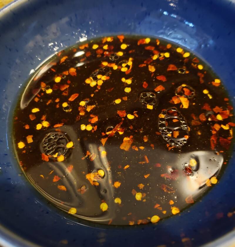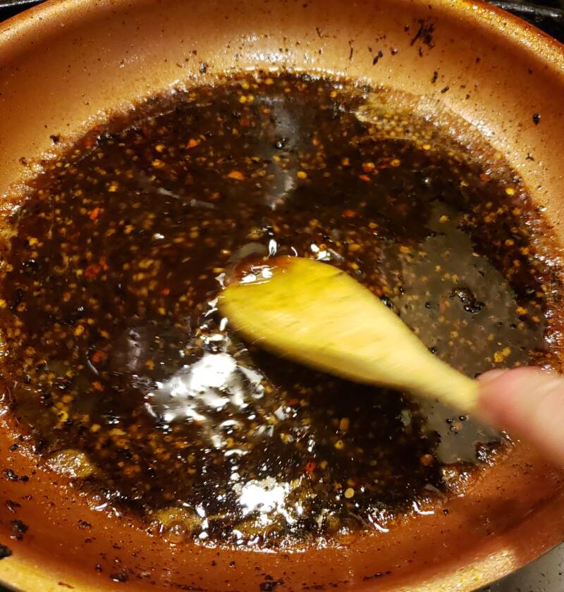 In a separate bowl, whisk together 2 teaspoons of oil, sherry, soy sauce, brown sugar and red pepper flakes.