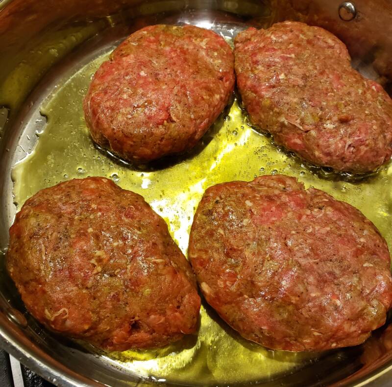 Drizzle some olive oil in the bottom of a frying pan and heat. Fry the patties in the oil until they reach an internal temperature of 160 degrees. The patties should be cooked all the way through with no pink in the middle. When the patties are cooked, remove them from the pan and keep them warm.