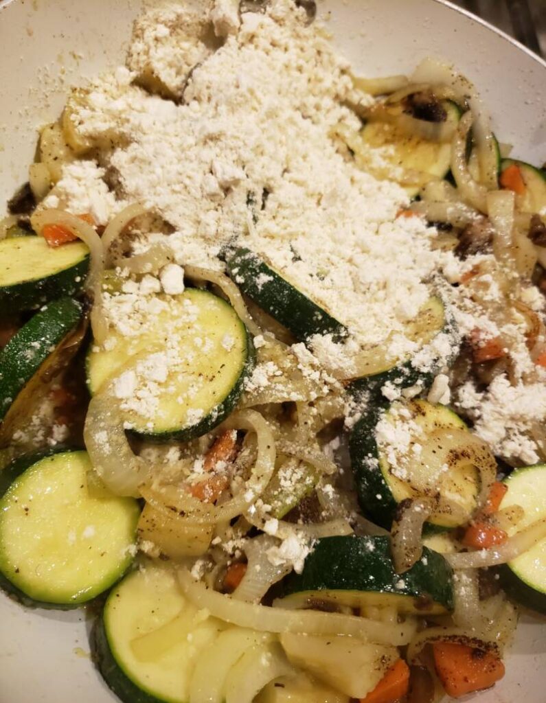 Sprinkle the vegetables with Carbquick or flour. You can use whatever flour you prefer, depending on your dietary restrictions. Carbquick is a low-carb flour alternative that I get from Walmart, but it is also available through Amazon. If you are not on a low-carb diet, you can use regular all-purpose flour or a gluten-free flour alternative. They all have the same effect for this purpose. Stir the vegetables and flour mixture and cook for several minutes.