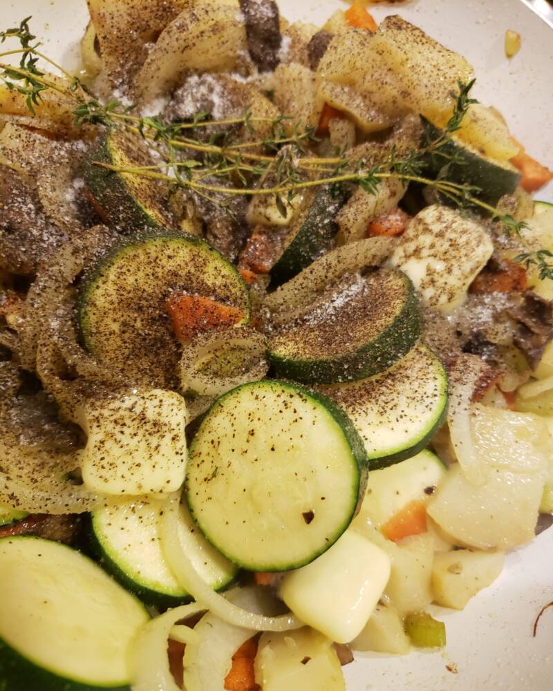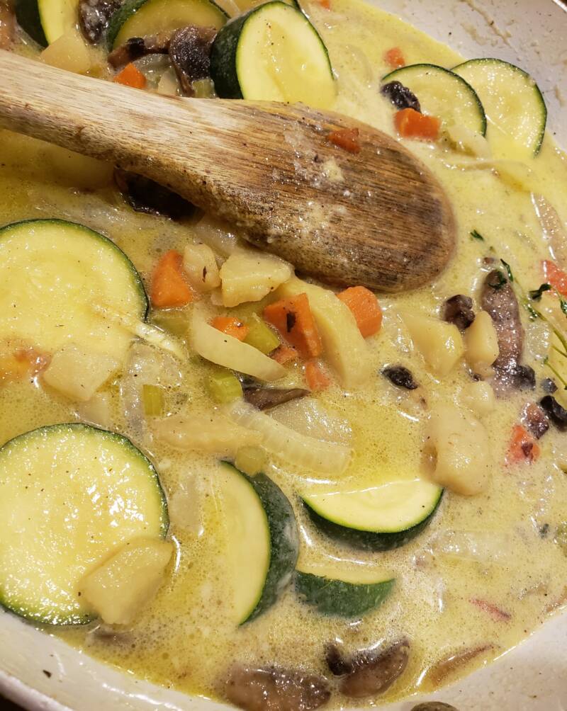 - Add zucchini, garlic, carrots, celery, onions, mushrooms and squash. Cook for 5 minutes until golden.