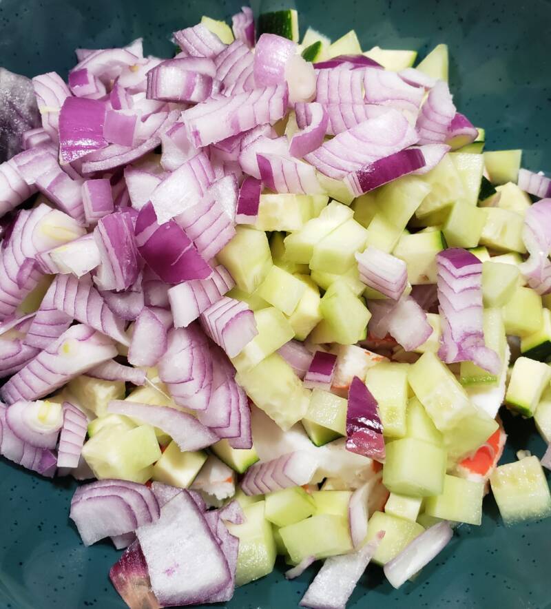 - Combine all the seafood, red onion, and celery In a medium bowl. Toss.