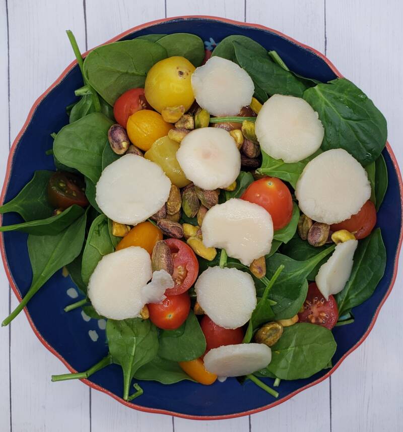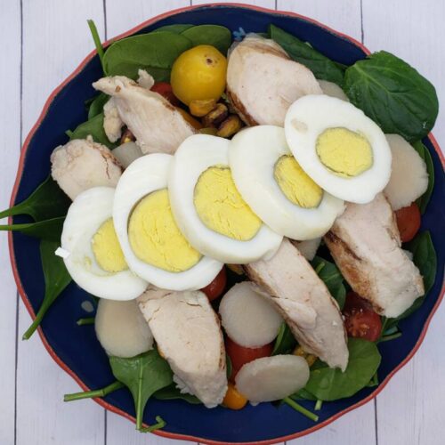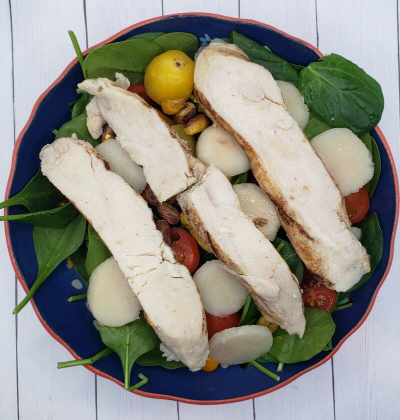 Place some of the Perdue Shortcuts Chicken strips on the top of each bowl. You can heat the chicken in the microwave or at room temperature. I have had this salad both ways, and I can tell you that it’s good either way.