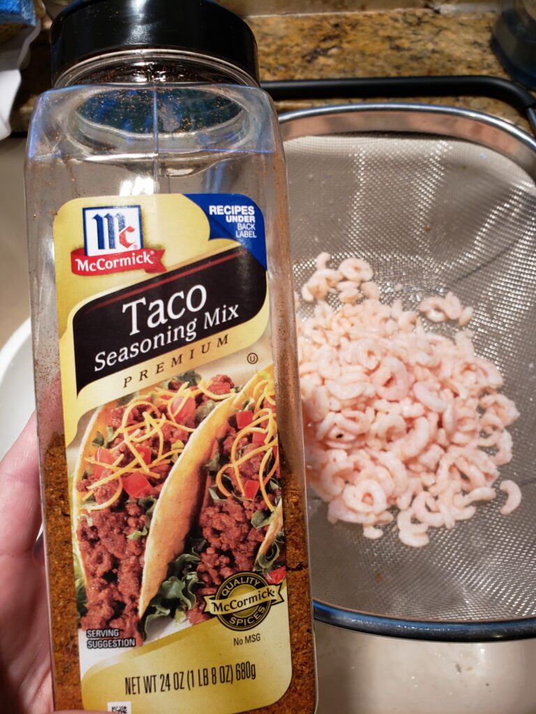 Season the shrimp with taco seasoning or fajita seasoning. On this day, I used taco seasoning. Usually, I just sprinkle the seasoning generously over the shrimp until I think it is properly seasoned, but two tablespoons is a good place to start, as the recipe says.
