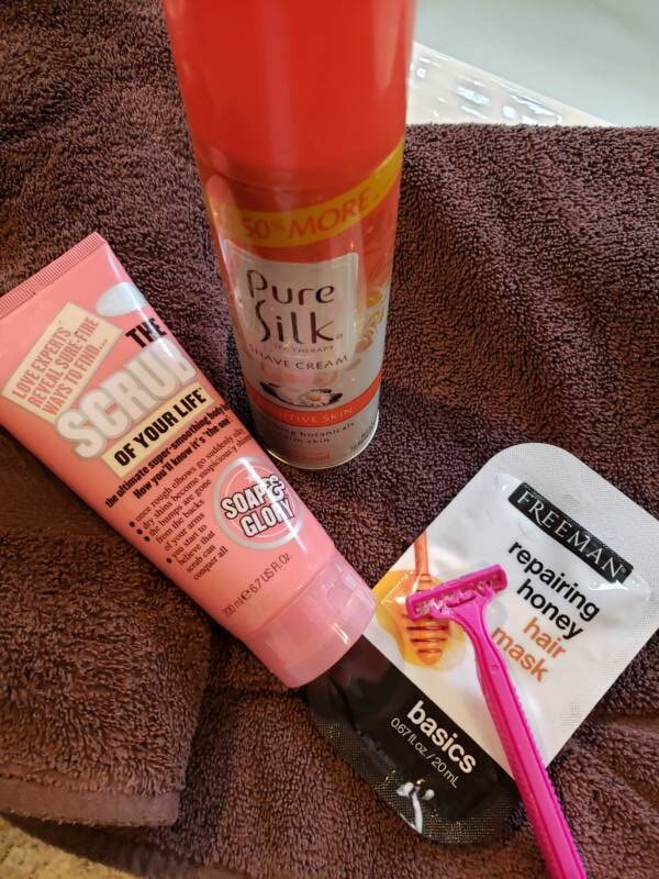 After soaking in the tub in sparkly bubbles, I usually rinse in the shower. I place a shower bomb in the shower for a pleasant scent. While in the shower, I give my hair a treatment with a hair mask. I also used a Soap and Glory body scrub and did any girly maintenance that I could do while in there. I love the Soap and Glory product line. They are a bit pricey but have some fun and unique products.