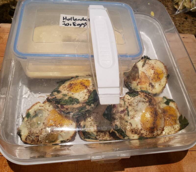 Serve each egg cup with some Hollandaise on top. I actually meal prep these by placing the cooked eggs in a square cupcake carrier with the Hollandaise sauce in a small container. The eggs and the sauce fit nicely in the cupcake carrier for easy grab, heat and eat breakfast.