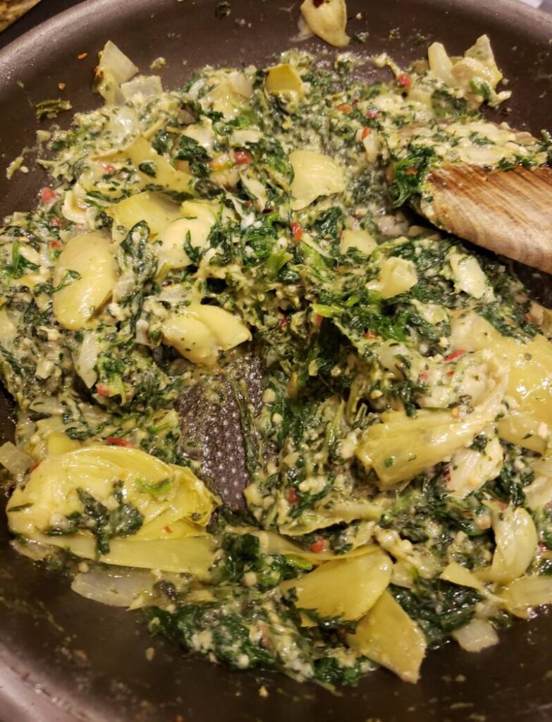 - Pour the spinach and artichoke mixture over the pasta and stir to coat.