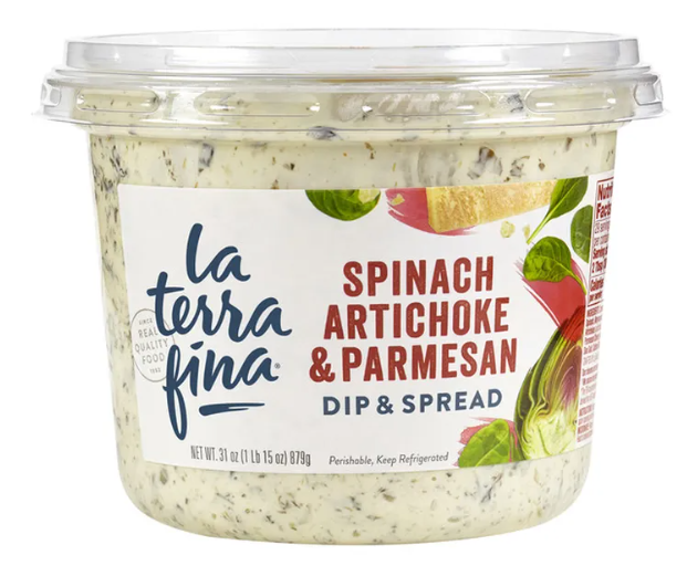 - Add the spinach artichoke dip purchased at Costco or Sam's. You can use something similar from the regular grocery store but may need to purchase two containers. The Costco/Sam's version comes in a large container that is the perfect size for this recipe.