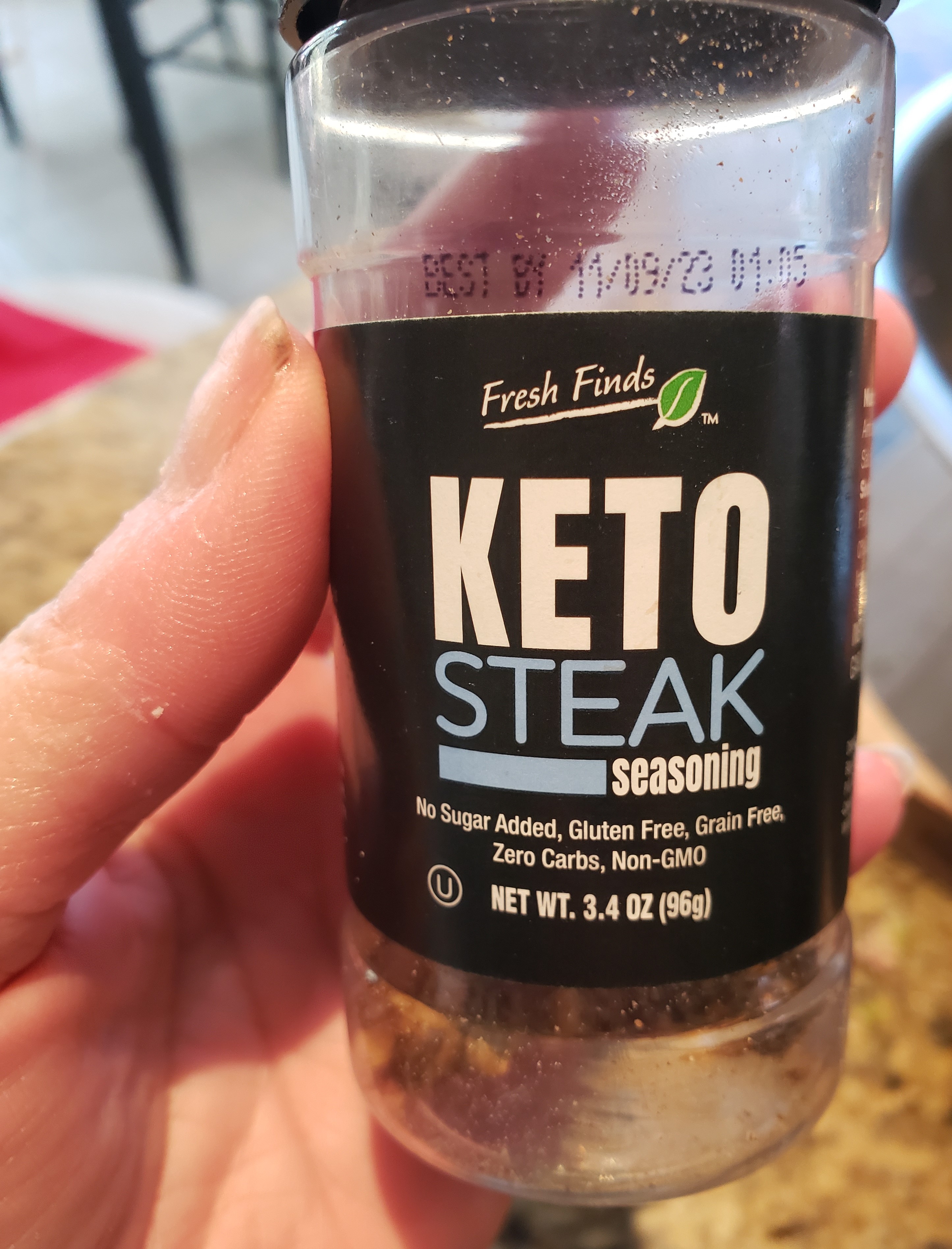 Sprinkle the steak with a grill seasoning of your choice. I like McCormick’s Grill Seasoning, but I didn’t have any. I did have some Fresh Finds Keto Steak Seasoning, which is basically the same thing, so I used that. Grill your steak according to your preferences. We like ours medium rare. I used to like my steak well done, but as I have gotten older, I prefer it rare more than I used to. I have an electronic meat thermometer that I like to use. I am all about kitchen gadgets as if you did not know. When the temperature reaches 135 – 140 degrees, I remove my steak from the grill and let it rest before slicing.