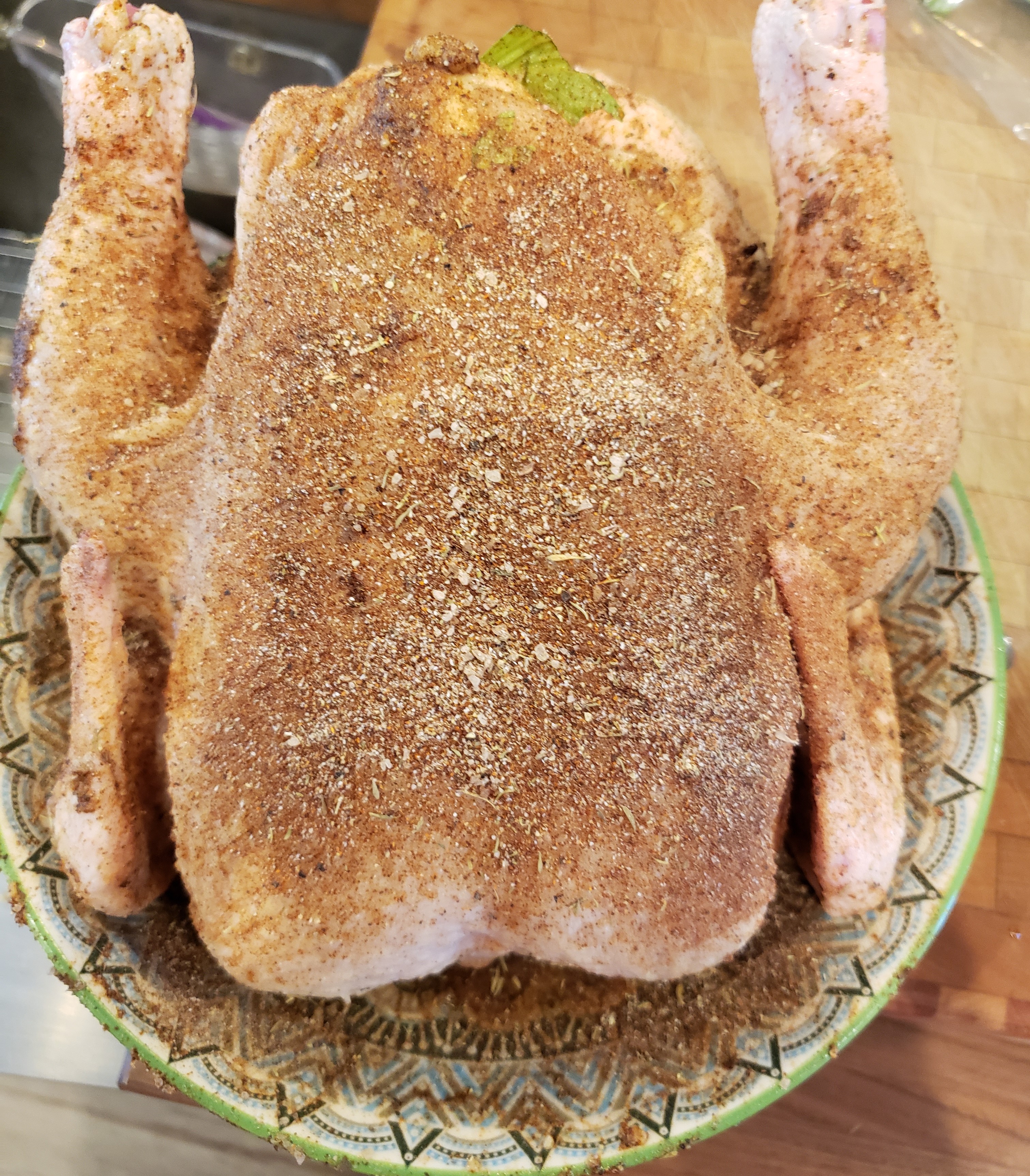Rub the chicken with the spice mixture, making sure to massage the spice on top of and under the skin and inside the cavity. You will have plenty of rub to thoroughly coat the chicken.