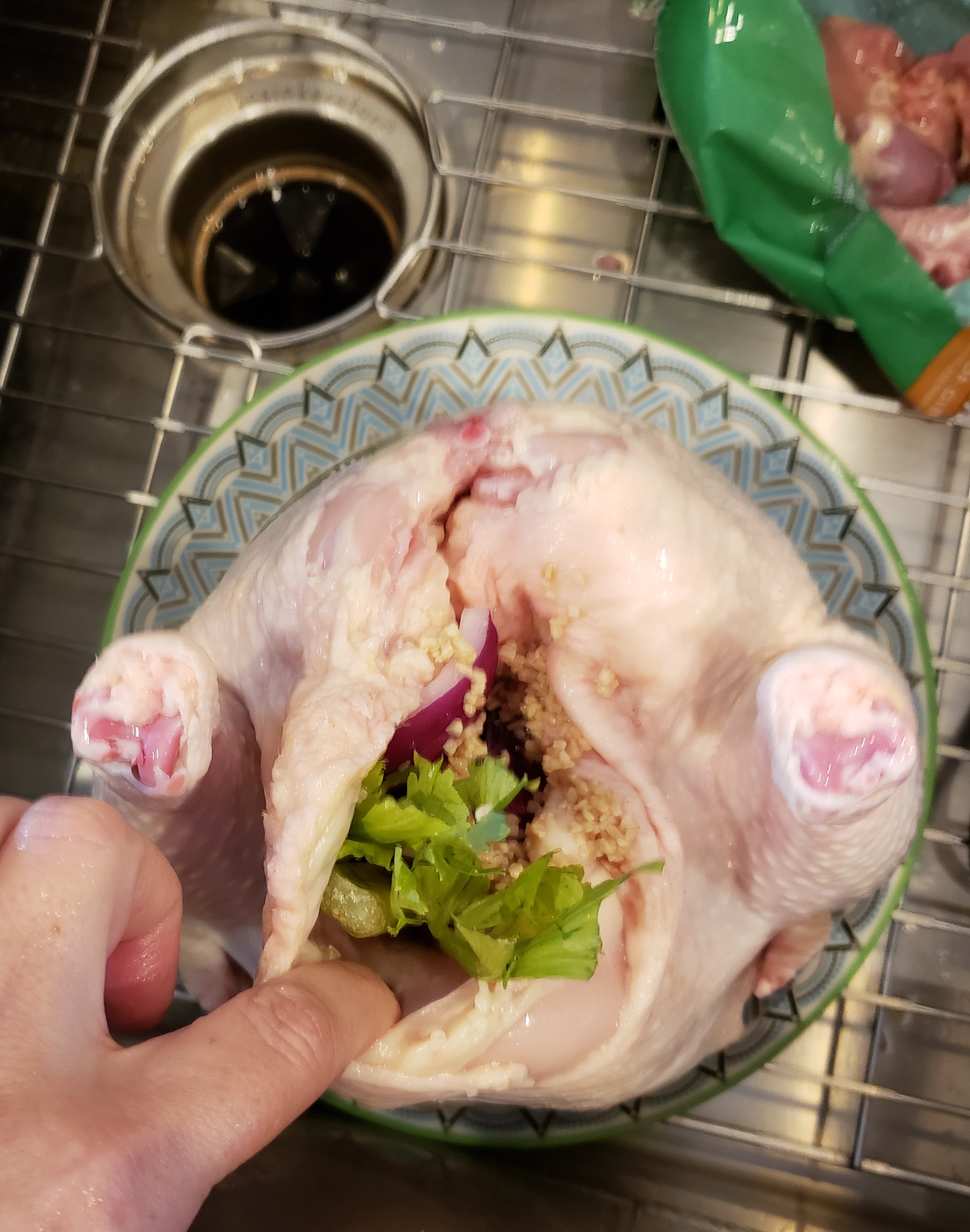 Thaw the chicken first. When the chicken is thawed, removed the gizzard and livers from the cavity. You can use those to make chicken stock or maybe you have a pet who likes chicken livers. Preheat the oven to 250 degrees.