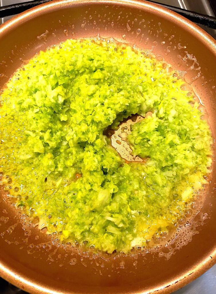In the bowl of a food processor, chop the celery, onion and green pepper. Saute the vegetable mixture in the butter for about 5 minutes.