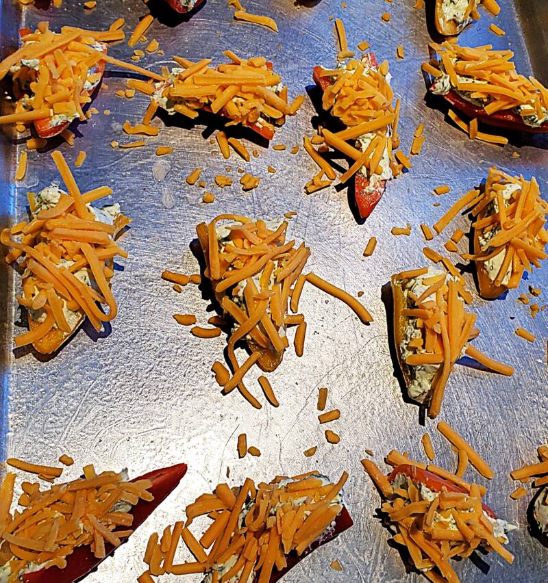 Slice the tops off of the mini peppers; then, slice each pepper in half lengthwise, trying to slice it in such a way that provides a cavity for each pepper; otherwise, the filling and cheese will not stay in the pepper as it bakes or grills.