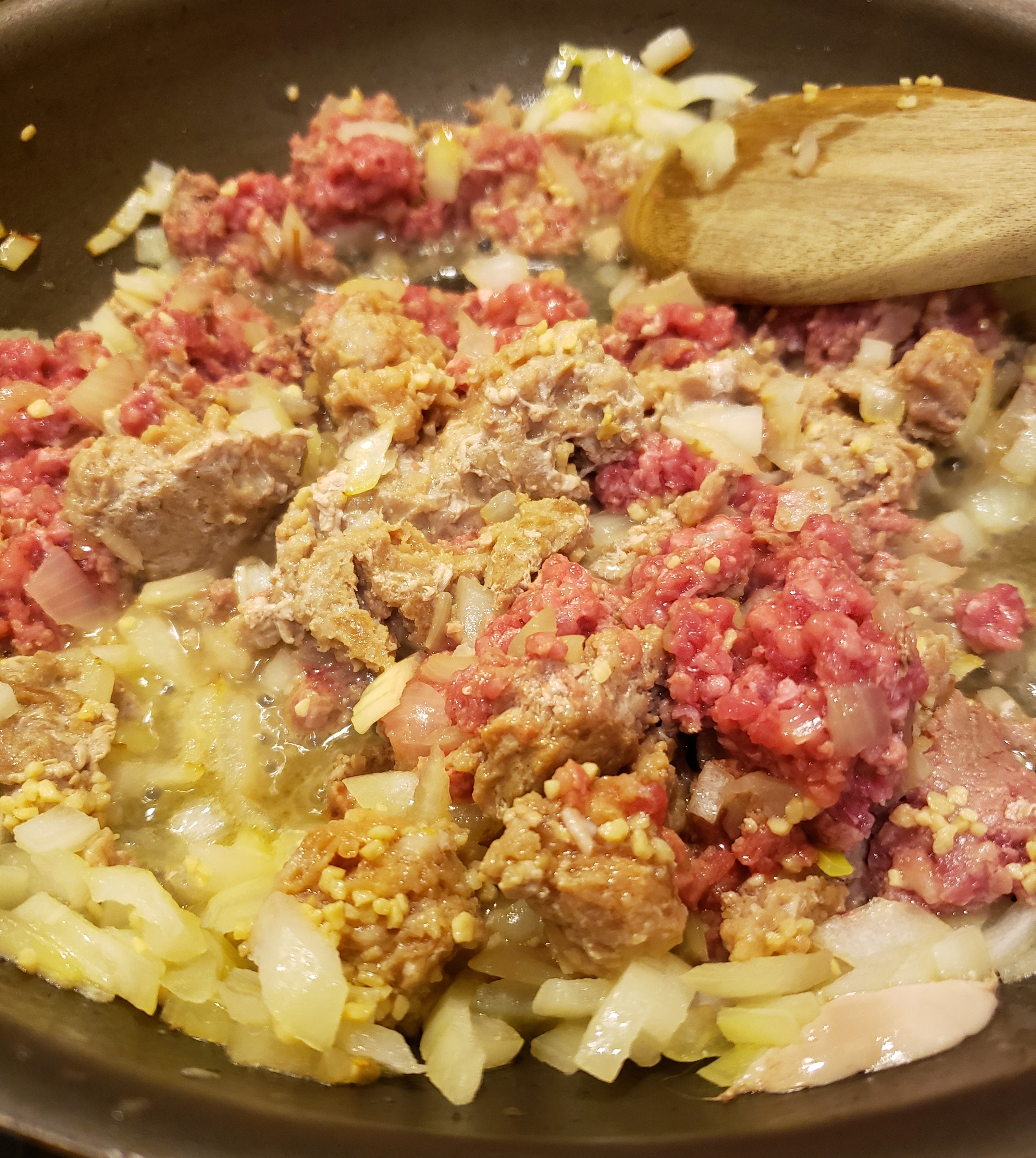 - In a frying pan, fry the ground beef with the onion and garlic. Cook until beef is browned. Drain off the grease.