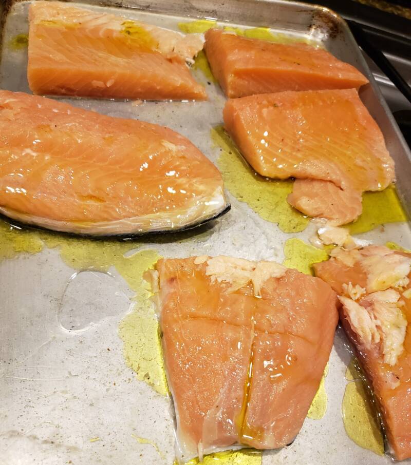 Place the salmon on a baking sheet, skin side down. Pour the wine and oil over the salmon.
