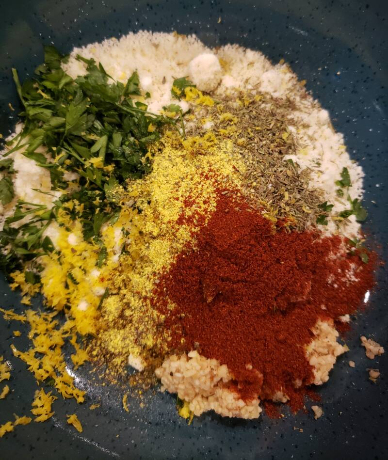 - Combine breadcrumbs, parmesan, parsley, thyme, garlic, garlic powder, Italian seasoning, lemon zest, lemon pepper, paprika, butter, salt and pepper in a medium bowl.