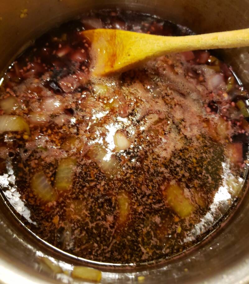Stir in the chocolate and onion soup mix. Stir. Reduce heat to low.