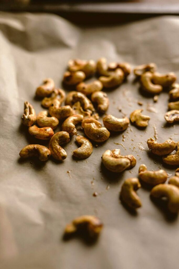 - Continue stirring until the liquid is evaporated and the cashews are coated.