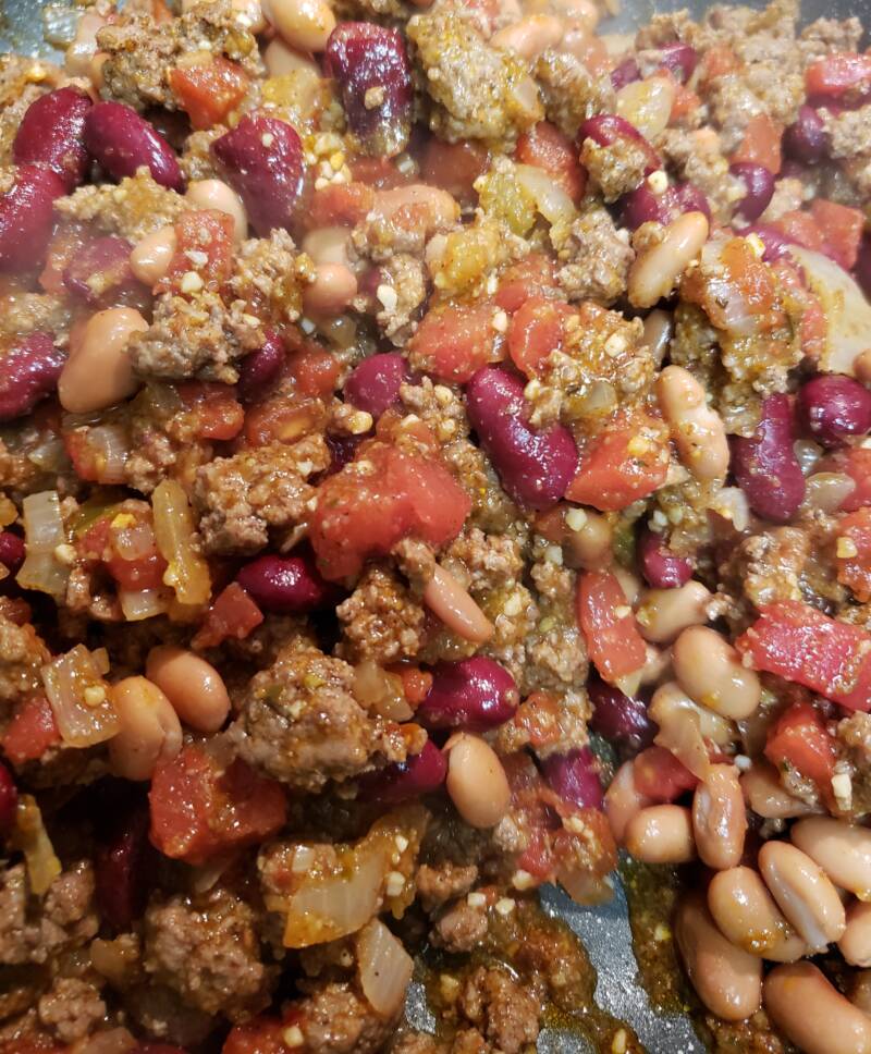 In a large skillet, brown the ground beef. Drain. Add the onion and garlic. Cook until the onion is translucent. Add the tomatoes, beans (if using) and taco seasoning. Simmer for 3-5 minutes.