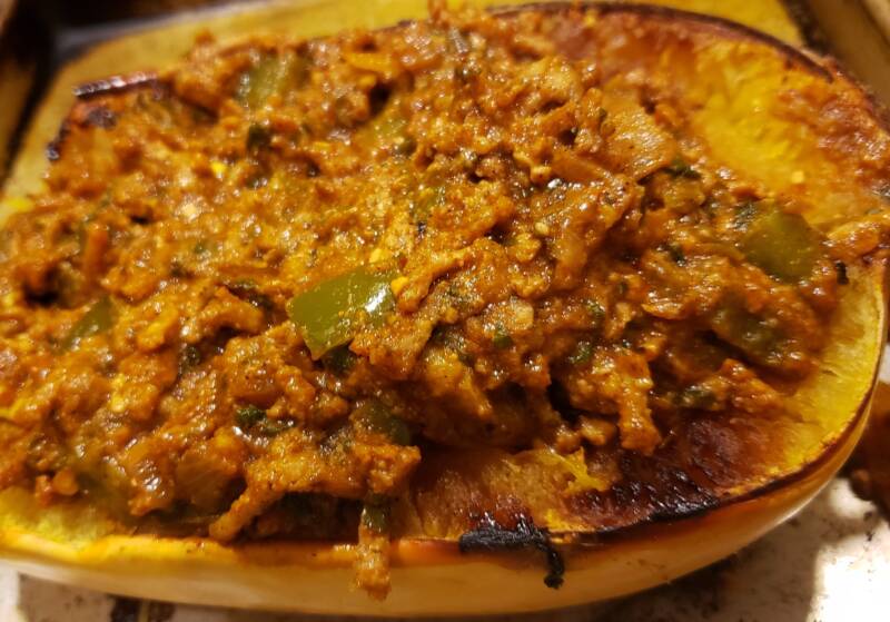 When the spaghetti squash is done, remove it from the oven or instant pot. Spoon the meat mixture into the cavity of the spaghetti squash.