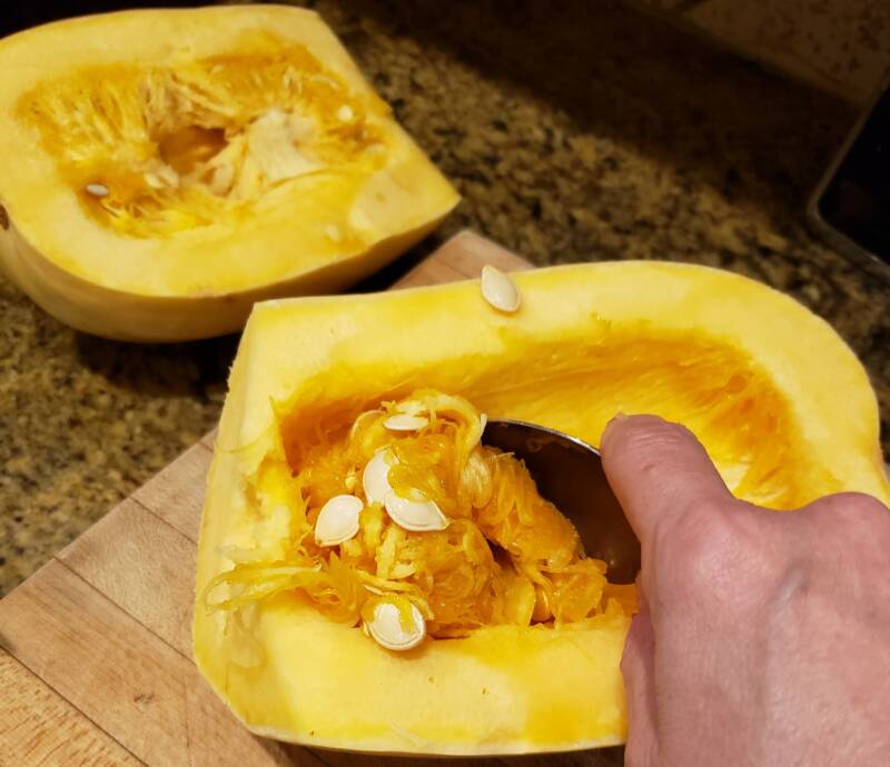Preheat the oven to 400 degrees. Slice the spaghetti squash lengthwise and scoop out the seeds.