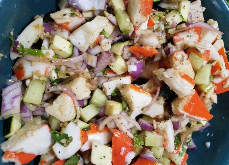 - Mix the crab with the green onion, red onion,jalapeno, cucumber and cilantro.