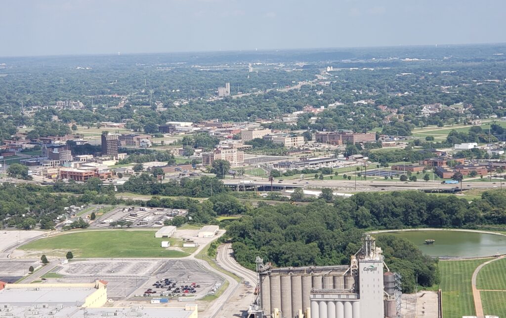 The best part of visiting the Gateway Arch is the view! Visitors can purchase tickets online or at the ticket counter at the base of the arch to travel to the top of the arch, where you can view the East and West to the horizon. Tickets cost $12.00 for adults and $8.00 for children. Tram entrances are located on either side of the arch base. A guide leads you to the tram elevators that will take you to the top, giving you safety tips and interesting facts about the arch along the way. Family groups are assigned to a futuristic-looking pod that is more like a roller coaster car than an elevator. The pod must accommodate the angle of the arch on the way up. Don’t worry, though! It is very slow, but it does zig and zag on the way up.