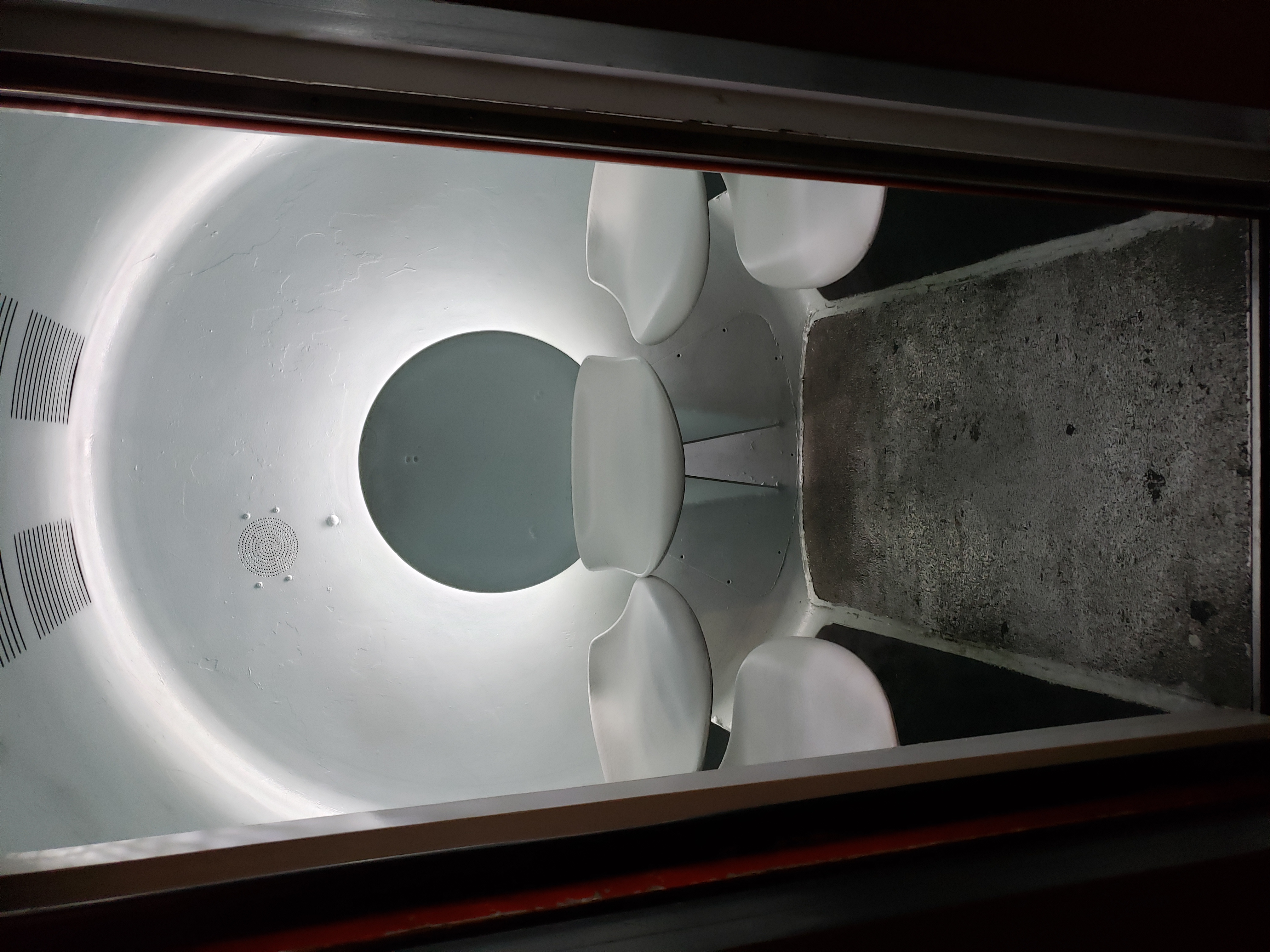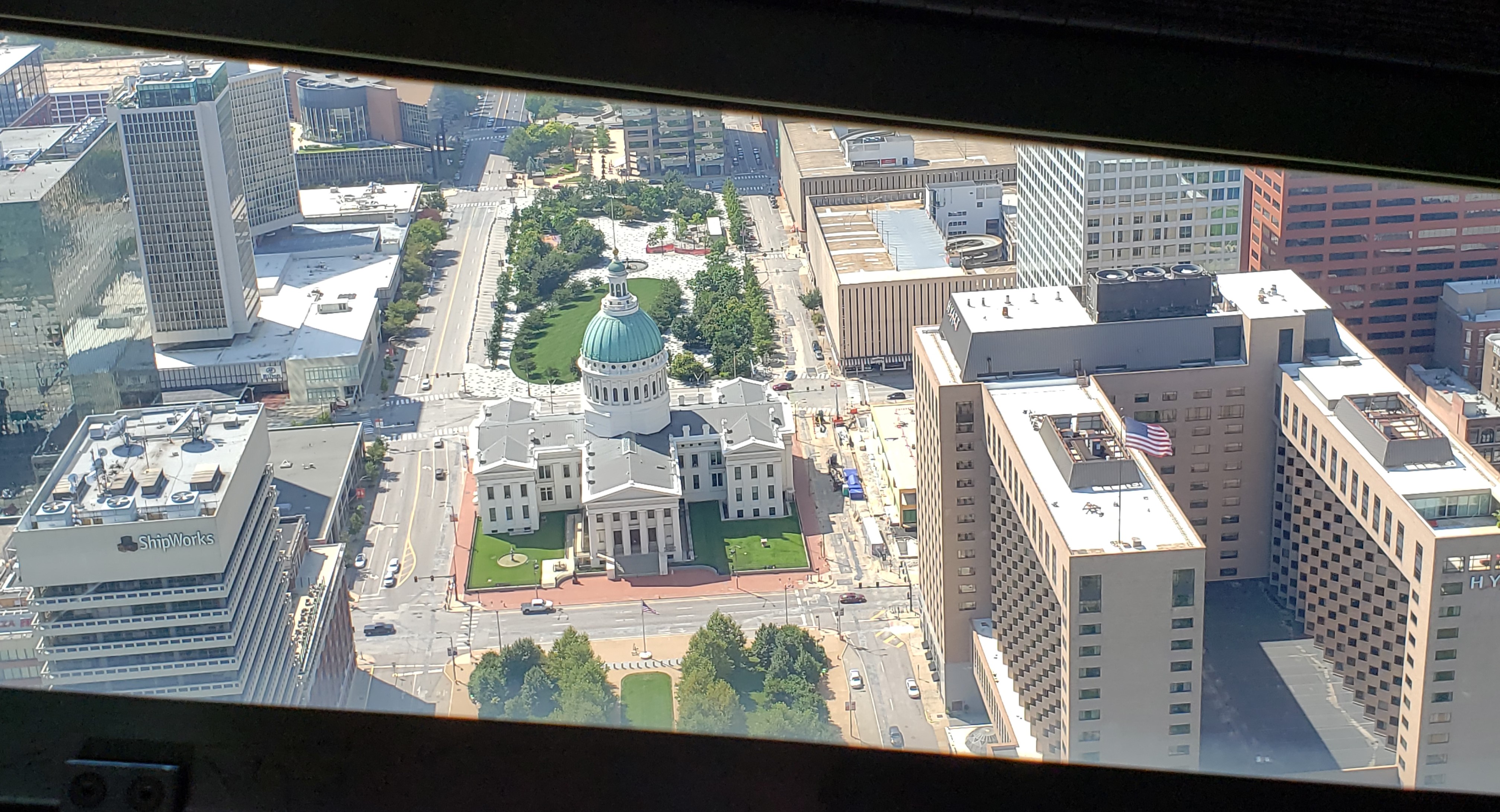 When you reach the top, you can look through the viewing windows set on each side of the arch. One side faces West and the other side faces East. On the West side, one can view the city, including nearby Busch Stadium and the Old Courthouse. The Eastside is a stark contrast to the Westside. Looking toward the East, one can see the Mississippi River and the countryside of Illinois and Kentucky. If it is a windy day and you stand still in the viewing area, you can feel the arch slightly swaying. The top of the arch is not very large, so only a small group of people are allowed for a certain amount of time so that the next group can enjoy a visit. to the top.