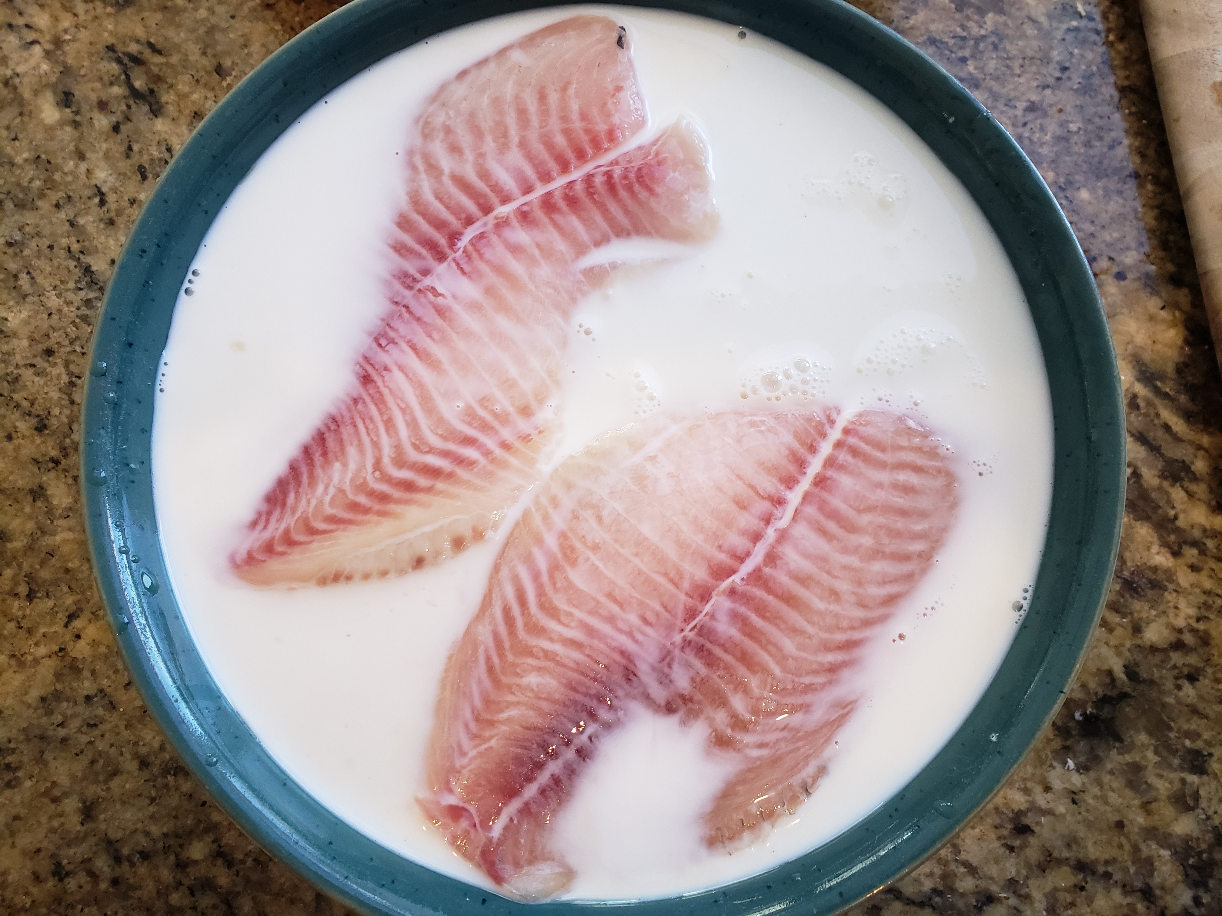 Soak the tilapia in milk to remove any fishy odor or taste. Drain and rinse well; then, pat dry.